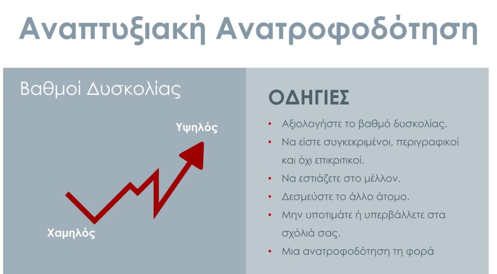 Κάθε φορά που σχεδιάζετε να παρέχετε αναπτυξιακή ανατροφοδότηση, σκεφτείτε το βαθμό πολυπλοκότητας/δυσκολίας που υπάρχει σε κάθε περίπτωση. Μερικές φορές η ανατροφοδότηση έχει πολύ χαμηλό επίπεδο δυσκολίας. Για παράδειγμα, όταν κάποιος κάνει κάτι λάθος και δεν το γνωρίζει, η απλή υπόδειξη του σωστού σε αυτό το άτομο θα αλλάξει τη συμπεριφορά.
